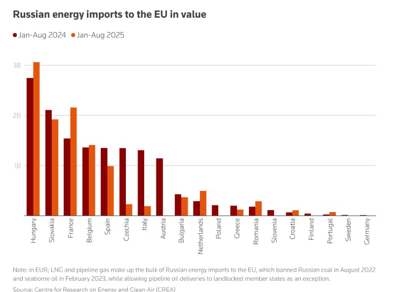 Въпреки че ЕС е намалил зависимостта си от Русия на енергийния пазар с приблизително 90% от 2022 г. насам, през първите осем месеца на тази година той е внесъл от страната петрол и газ на стойност 11,4 милиарда евро. Франция например е снабдила руски доставчици, които след това споделят с бюджета, 40% от който отива за военните и силите за сигурност, 2,2 милиарда евро (увеличение от 40%). Холандия е отбелязала 72% увеличение на покупките, въпреки че в номинално изражение те са останали сравнително малки на ниво от 498 милиона евро.